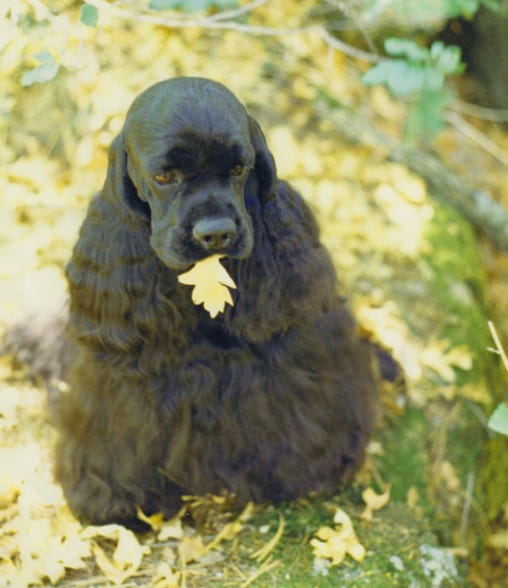 My first foundation bitch, Ch. Three Crown’s Gold Fever, CD was bred by Robin and Rune Nilsson and sired by Ch. Kapewood Prince Matchebelli out of Ch. Enos Acres Pretty Poison. “Lucy” lived to be 15+ years old and is behind all eight generations of Mardi Gras cockers.