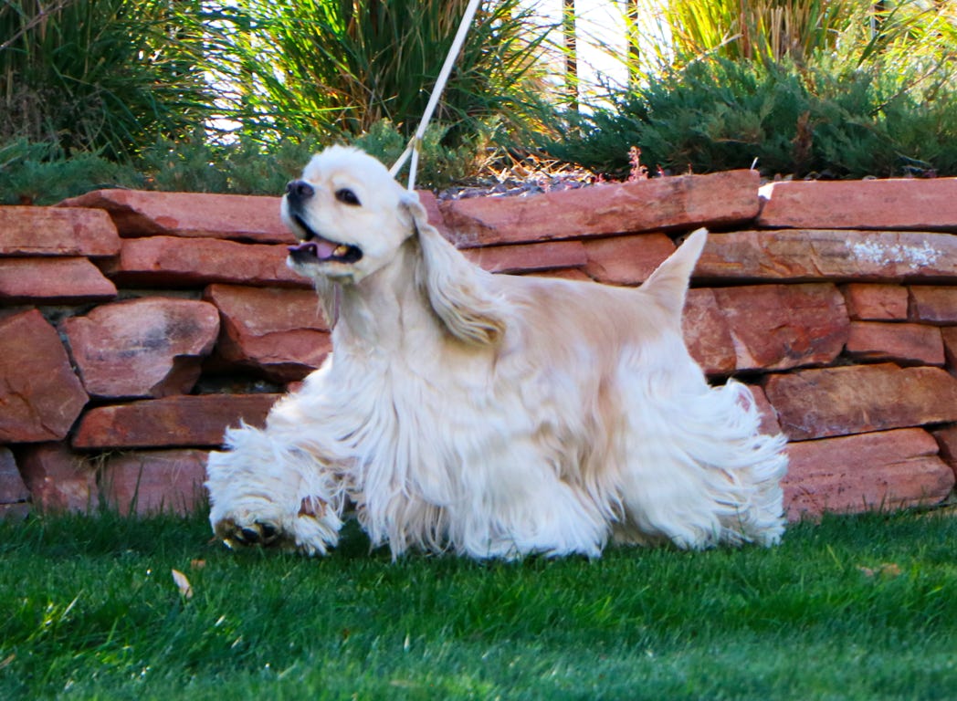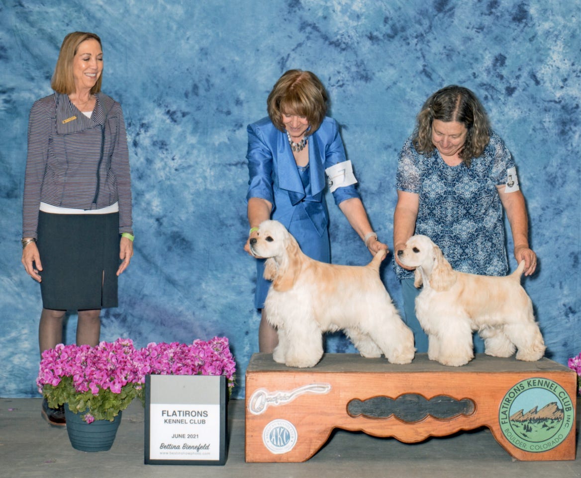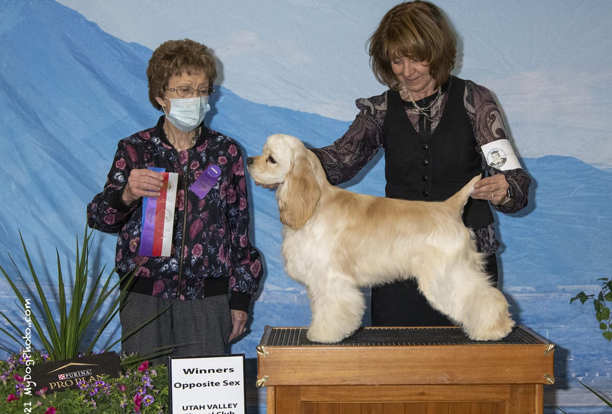 ^ Peyton , always the showman, wins BOV at the GDACSC specialty under breeder judge Patti Darke.