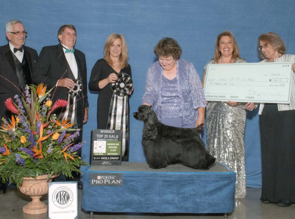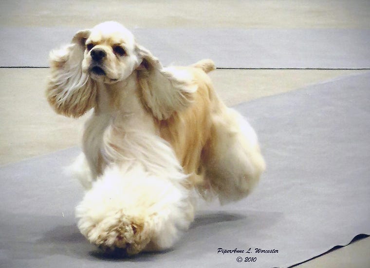 My first foundation bitch, Ch. Three Crown’s Gold Fever, CD was bred by Robin and Rune Nilsson and sired by Ch. Kapewood Prince Matchebelli out of Ch. Enos Acres Pretty Poison. “Lucy” lived to be 15+ years old and is behind all eight generations of Mardi Gras cockers.