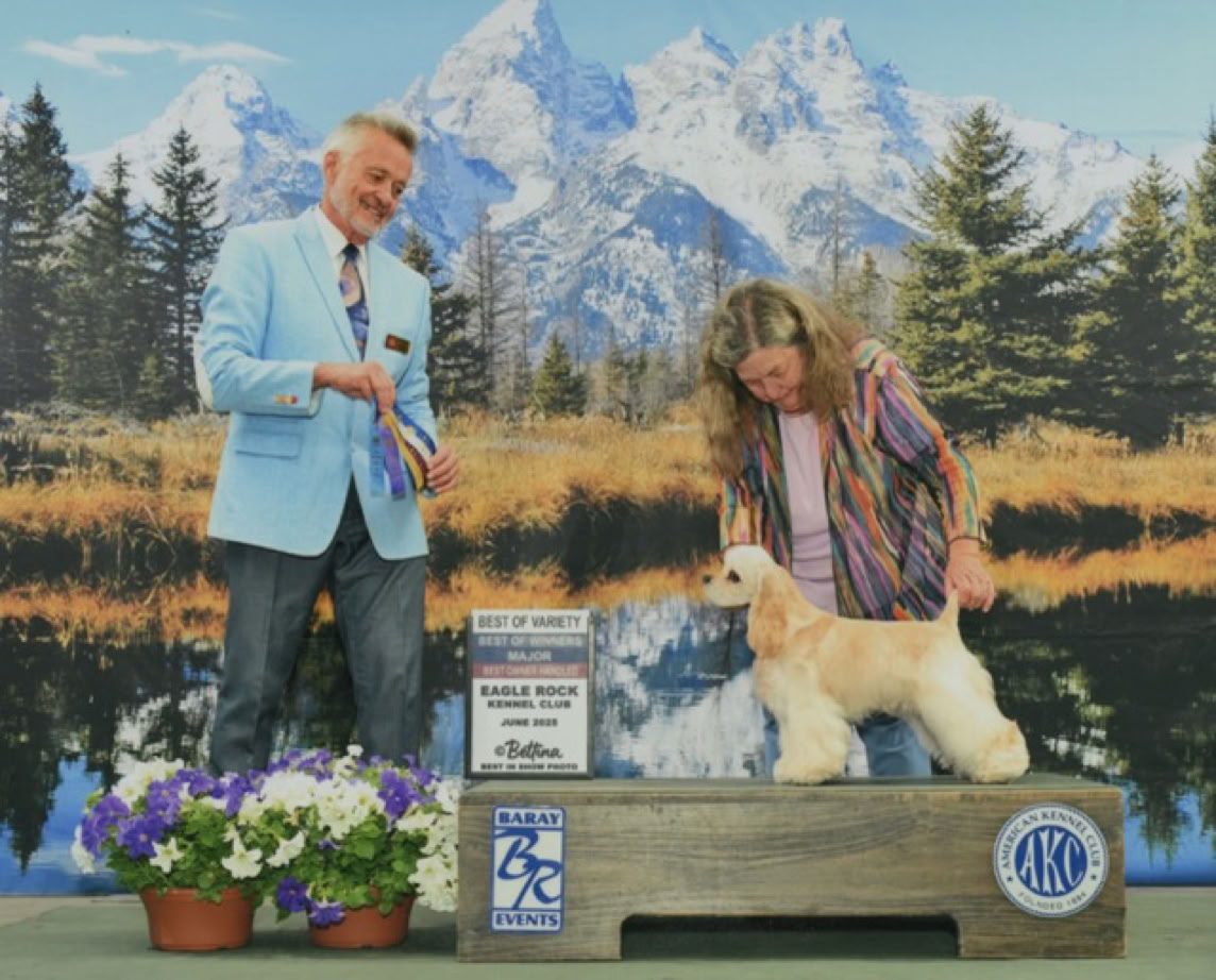 ^ From his first litter, Mardi Gras Good Golly Miss Molly earned her 1st major with a BOV from the puppy class, at 8 months of age, over a Group winning special at the Blackfoot KC shows >