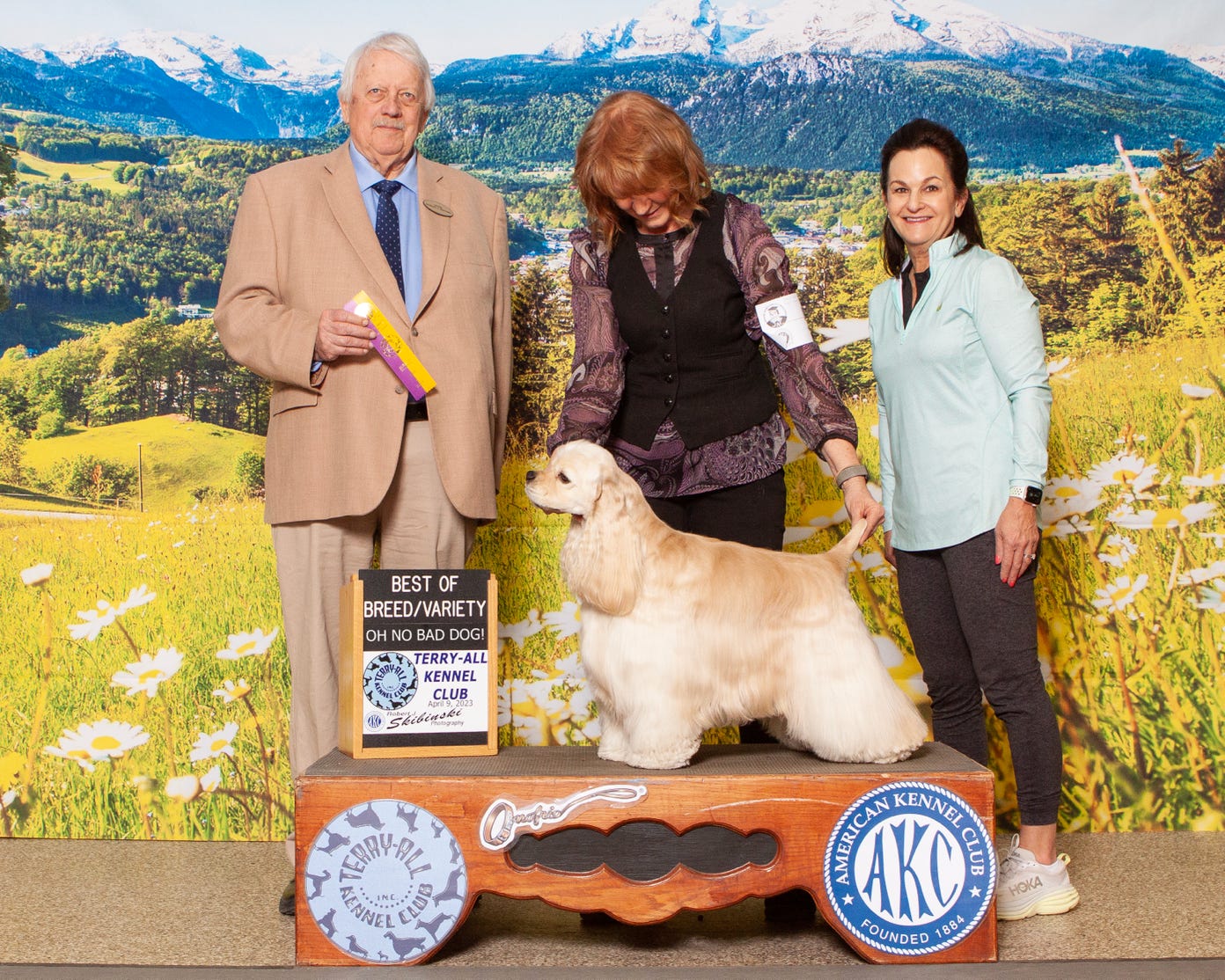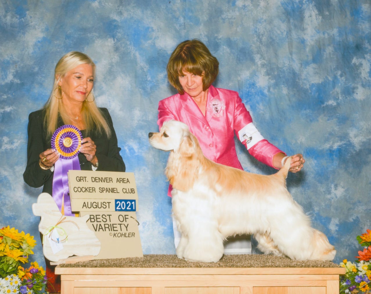^ Peyton , always the showman, wins BOV at the GDACSC specialty under breeder judge Patti Darke.